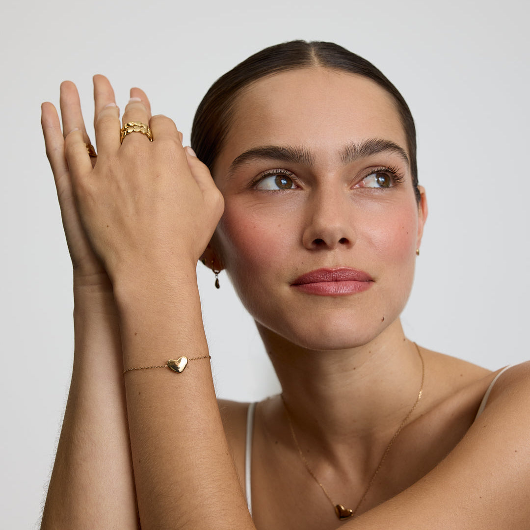 A dainty bracelet featuring a bubble shaped heart, perfect for layering or gifting with love.