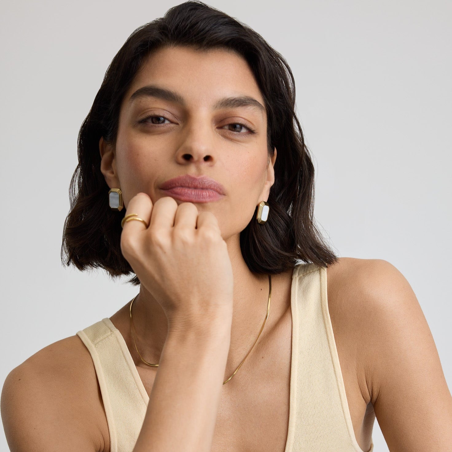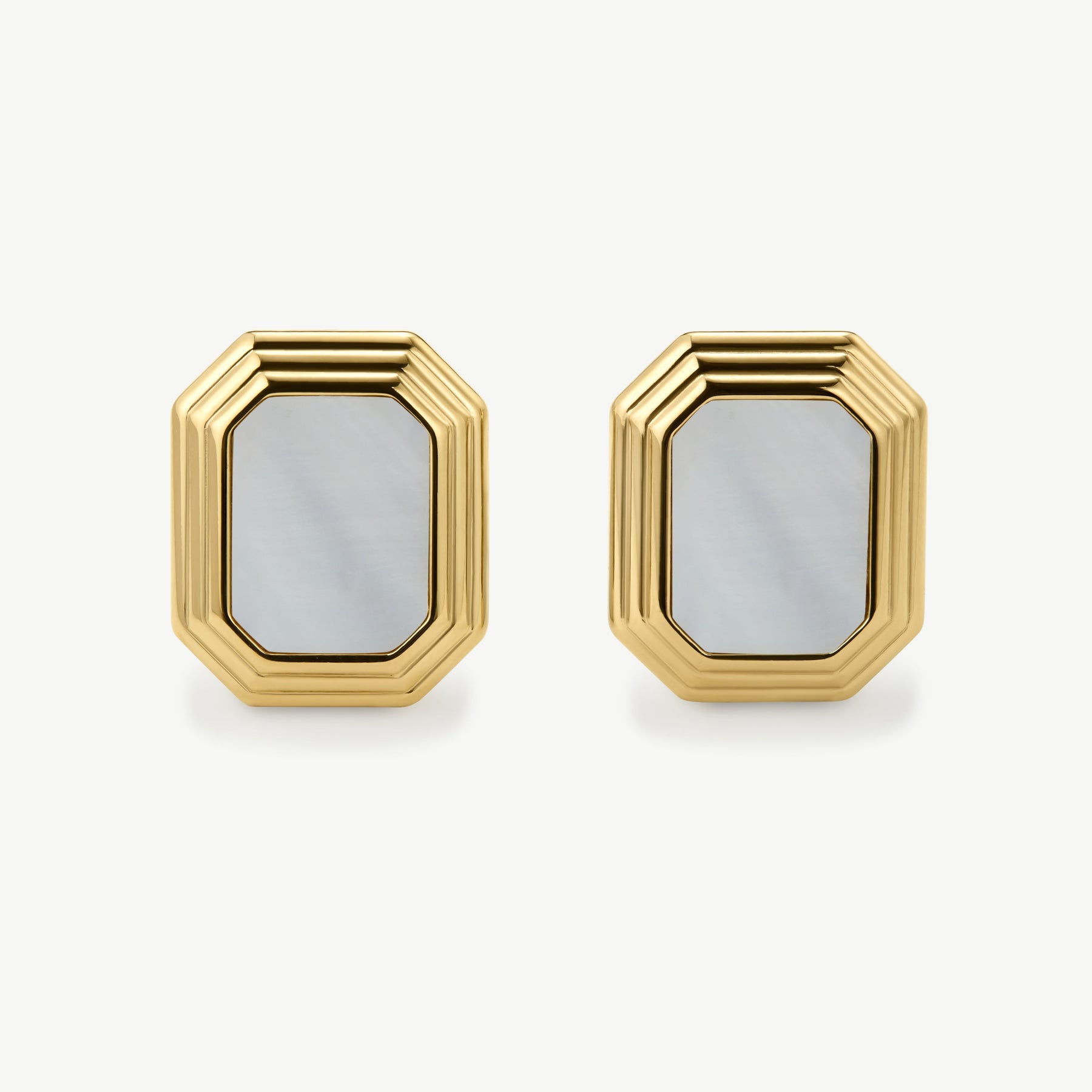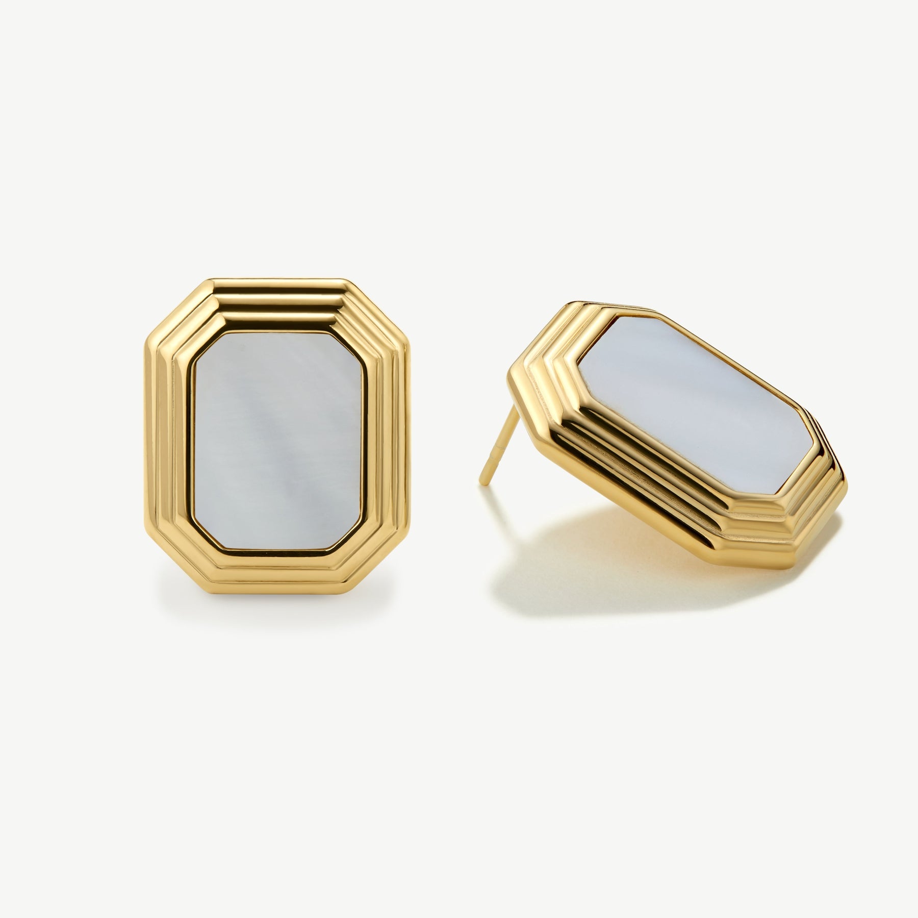 These stunning studs feature a bold mother of pearl accent, adding a touch of elegance and a statement to your look.